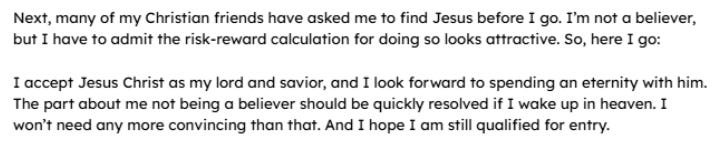 Turns out, he was employing Pascal’s Wager. He wasn’t a believer; he just said he accepted Jesus Christ, as if those words had magical powers and an omniscient God wouldn’t be able to see this as a risk-reward analysis. His conversion didn’t come from a place of genuine belief, because as we’ve learned, you can’t will yourself into believing something. He was a non-believer at the time of his death and decided to try hedge his bets.