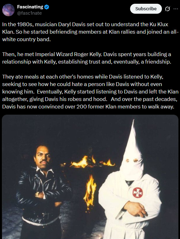 There is a belief roaming the world that some people are too far gone, that there’s no point trying to change their mind, we must shun and remove them from society, and usually this concerns one specific belief - racism. This is categorically false. Darryl Davis is living proof of this. Racism is just another belief; there’s nothing special about it that makes it impossible for them to change their minds.